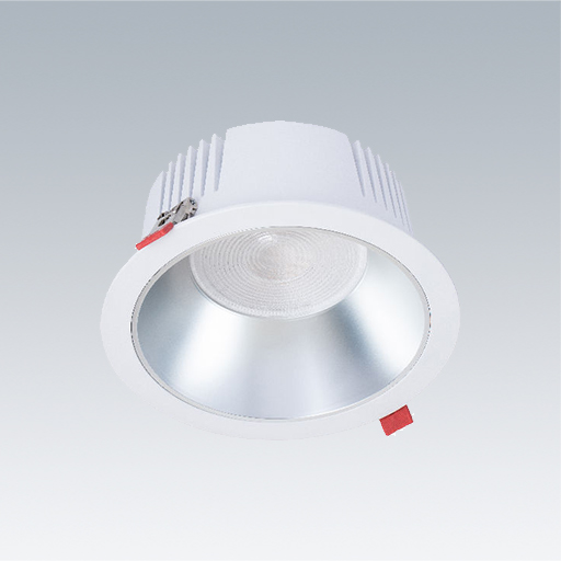 A high performing, low height, recessed LED downlight. DALI dimmable LED driver. Body: die-cast aluminium, powder coated white. Reflector: matt aluminium. Diffuser: opal polycarbonate. Class II electrical, IP44_IP20, Impact strength: IK08. Spring clips suitable for quick installation. Cut-out: Ø200mm. Complete with 4000K LED. Fitted with flex and plug.. Note: UGR<19 for office applications compliant with CIE testing method.