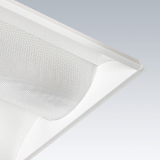 A set back recessed LED luminaire. Electronic, DALI dimmable control gear. Class II electrical. IP20 Impact strength: IK02. Body: white painted steel. Diffuser: dual layer curved microprismatic diffuser within a linear profile. Baffle: aluminium extrusion with return air handling slots and baffles. Fitted with flex and plug. Complete with 4000K LED, Colour Rendering Index min.: 90. COI approved LED.