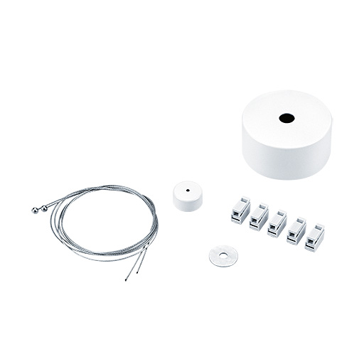 1x round shaped ceiling rose in white, 5x electrical connector, 1x ceiling mount element in white, 2x suspension wire (3m), 1x washer