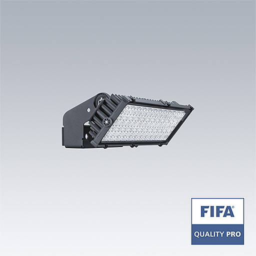 A high powered LED floodlight with optic 1: asymmetric 60°; light distribution from 144 LEDs. External control gear, supplied only by Thorn Lighting (maximum driving current 1250mA) and wiring with H07 RN-F cable type with mini diameter 13mm, to be ordered separately. Class I electrical, IP66, IK08. Heatsink: die-cast aluminium powder coated dark sandy grey (close to RAL 7043). Mounting bracket and frame: dark sandy grey (close to RAL 7043). Cover: 4mm clear glass. Bracket mounted using fixation points available (one M20 screw or two M14 screws). Low flicker operation (<1%) suitable for HDTV broadcasting. Complete with 4000K LED