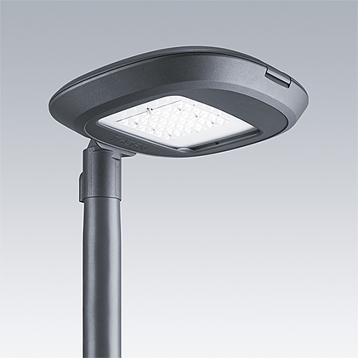 A highly versatile LED lantern with a Narrow Road, asymmetric distribution. Electronic, fixed output control gear driving 12 LEDs at 700mA. Compatible with PL, LRT, 7 pin Nema socket. Class II electrical, IP66, IK10. Housing, canopy and spigot: die-cast aluminium (EN AC-47100) powder coated anthracite (close to RAL7043).. Enclosure: 6mm thick clear glass.. Complete with 4000K LED. Post top mounting to Ø60mm column, tilt 5°, adjustable from 0° to +10°.