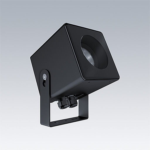 Caelon S adjustable surface mounted spotlights for the illumination of architectural facades, feature details, niches and structures. Class I electrical, IP66 with wide beam distribution. Equipped with Fixed output driver. Body: die-cast aluminium in black. Stainless steel screws. ambient temperature: -20°C to +25°C. Complete with 4000K LED.