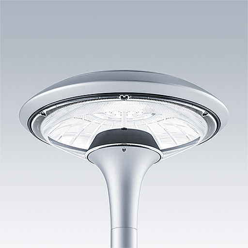 Plurio Direct: A decorative post-top LED lantern with radially symmetric distribution. LED driver with 18 LEDs driven at 350mA. Class I electrical, IP66, IK08. Base: cast aluminium, powder coated silver-grey. Canopy: disc shape, aluminium, textured silver-grey. Diffuser: UV stabilised, clear polycarbonate with anti-glare prisms. Direct, lens based optic with internal reflector. Equipped with 50% power reduction circuit, effective 3 hours before and 5 hours after a calculated midnight. It can be deactivated at installation with an easily accessible internal switch. Complete with 4000K LED. Post top mounting to Ø60mm column.