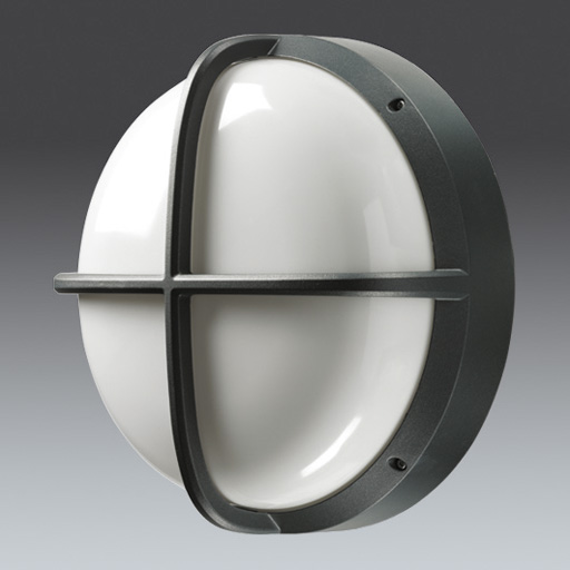 Round, impact resistant LED bulkhead luminaire. Electronic, fixed output control gear. Class I electrical, IP65, IK10. Body: small size, die-cast aluminium (LM6), powder coated anthracite. Diffuser: opal polycarbonate with die-cast aluminium cross feature. Electrical connection via 3 x 2 x 2.5mm² terminal block. Complete with 4000K LED