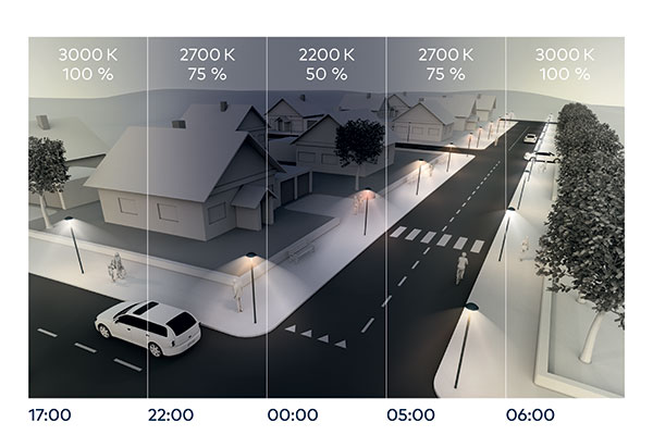 To see how NightTune works in practice, imagine a normal night. In the evening when there is still some foot and road traffic, NightTune provides a moderate colour temperature. During the middle of the night when roads are quiet, the output of the cool LEDs is reduced, so that the light also becomes dimmer and warmer. As morning approaches and traffic returns to the streets, the output of the cool LEDs increases once again, to provide brighter, cooler light that meets the higher safety demands.