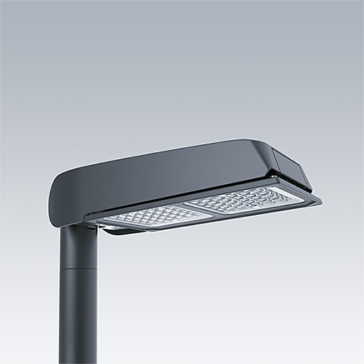 Lanterne d’éclairage routier LED de taille Large avec 60 LED et une optique Route étroite 500mA. Electronique,Classe électrique II, IP66, IK08. Corps : aluminium (EN AC-44300) Moulage sous pression, gris anthracite 900 sablé thermopoudré. Fermeture : verre plat trempé. Cadre blanc avec un bord gravé. Vis : Acier inox, traitement Ecolubric®. Livré avec un adaptateur d’emmanchement Ø 76 mm qui convient pour montage top (inclinaison 0°/5°/10°) ou latéral (inclinaison -20°/-15°/-10°/-5°/0°). Equipé d’un circuit de réduction de puissance, contrôlé par un câble à phase commutée supplémentaire. MARCHE = 100 %, ARRET = 50 %. Livré avec LED 4 000 K. Protection contre la surtension : mode commun à une impulsion 10 kV et mode commun multi-impulsions 8 kV et mode différentiel multi-impulsions 6 kV. Si un système DALI permanent est connecté, mode différentiel et mode commun multi-impulsions 6 kV.