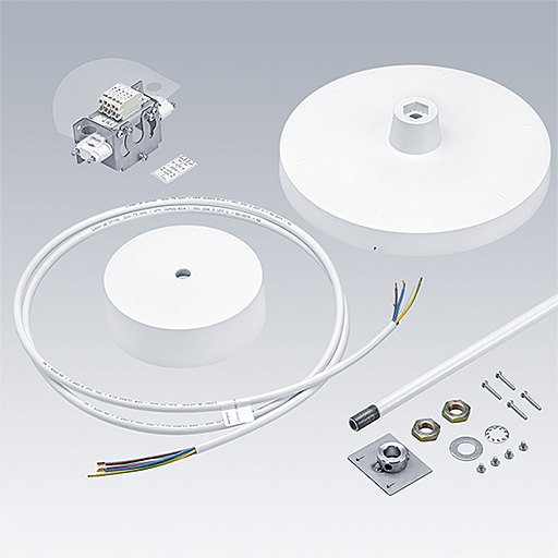 Suspension sur tige pour la gamme de produits NOVALINE Style. Accessoire pour taille S, consistant en un mât blanc de 1.000 mm de long, borne de raccordement, plaque de retenue avec couvercle blanc, rosace de plafond en plastique blanc et câble d’alimentation.