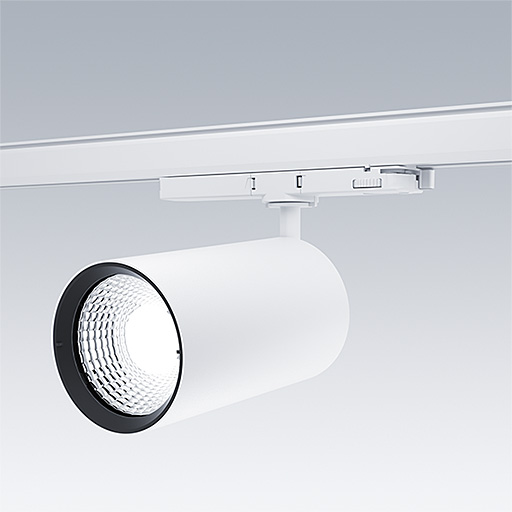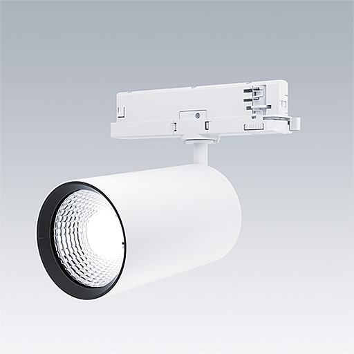 Projecteur LED pour installation sur rail triphasé avec distribution lumineuse de type projection et température de couleur stabilisée. Electronique, non gradable. Classe électrique II, IP20. Corps : aluminium Moulage sous pression, peinture microtexturée blanc. Réflecteur : PC poudré. Projecteur orientable sur le plan horizontal de 360° et inclinable sur le plan vertical de 90°. Livré avec LED 3 000 K