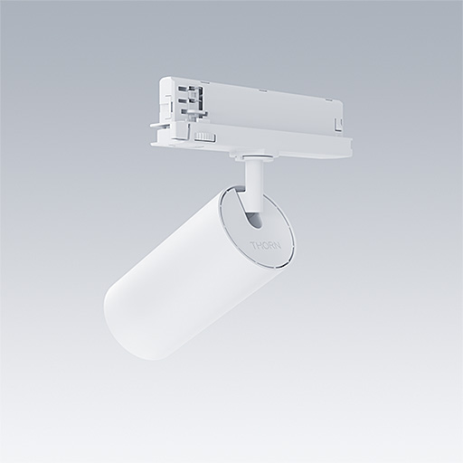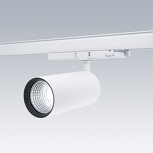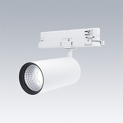 Projecteur LED pour installation sur rail triphasé avec distribution lumineuse de type spot et température de couleur stabilisée. Electronique, non gradable. Classe électrique II, IP20. Corps : aluminium Moulage sous pression, peinture microtexturée blanc. Réflecteur : PC poudré. Projecteur orientable sur le plan horizontal de 360° et inclinable sur le plan vertical de 90°. Livré avec LED 4 000 K