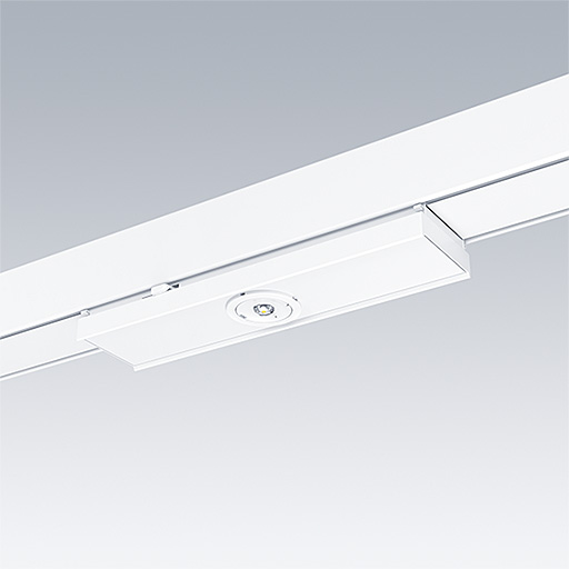 Luminaire de secours à LED pour un montage sans outil sur le système de rail Contus de Thorn. Optique orientable et pouvant être fixé par pas de 45°.